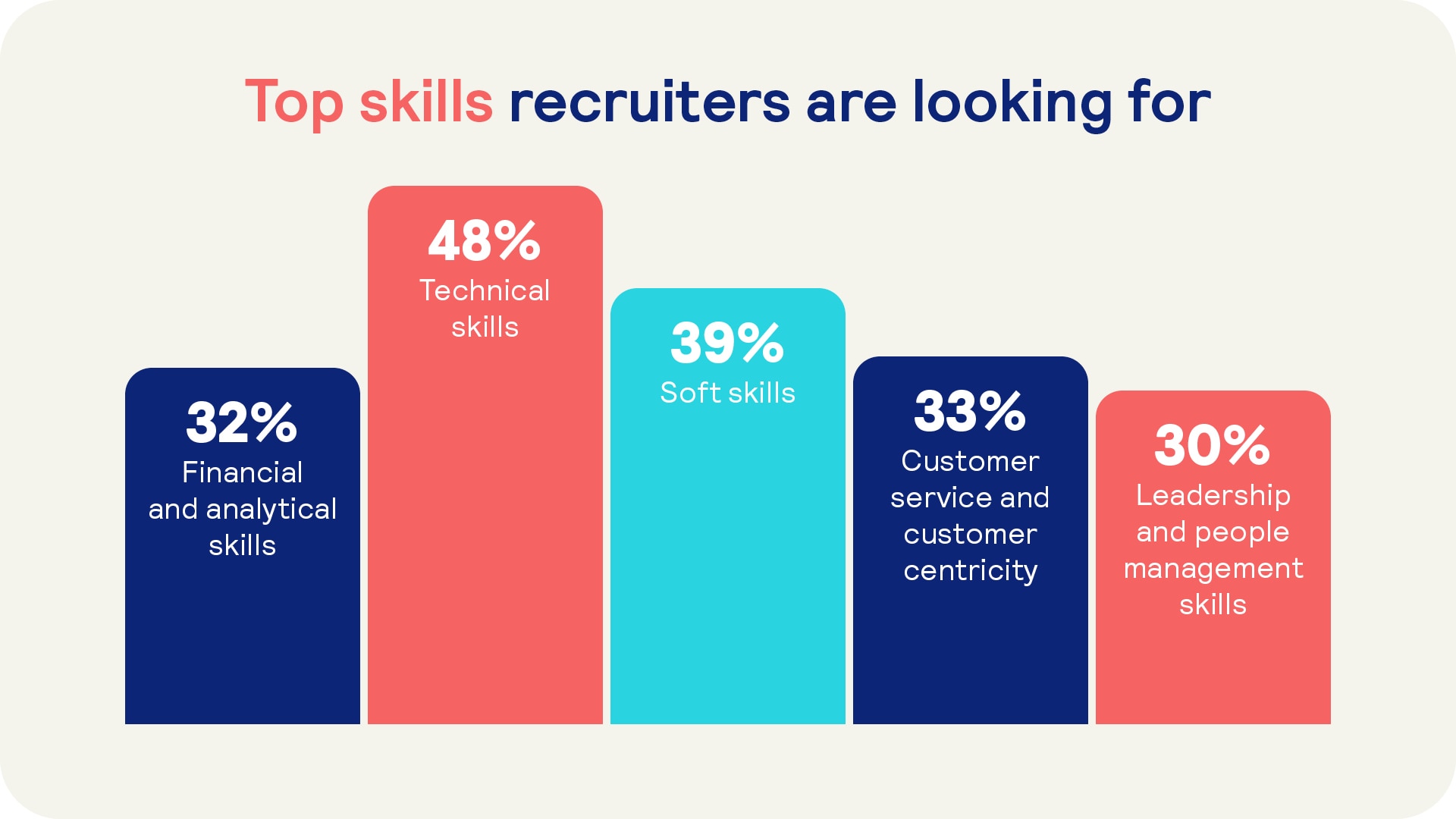 - Soft skills such as problem-solving, collaboration, and communication are on top of recruiters’ list when it comes to skills (38%).